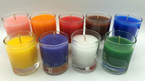 Votive Candles- 2 ounces which are great for office situations or when a quick burn is desired. They burn continuously for 17 hours. These are offered in a limited range of use such as love, good luck, protection, money, uncrossing/evil removing, power, control.