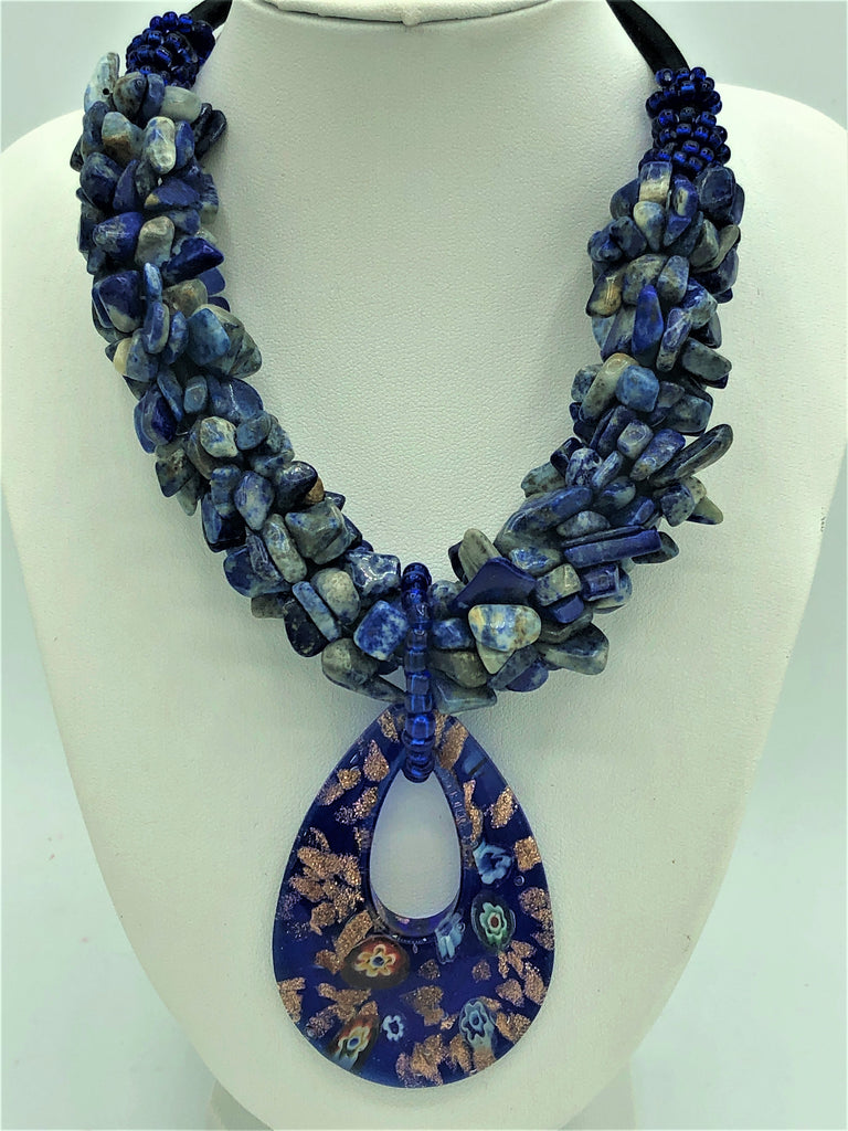 This statement piece necklace features a handmade Murano glass pendant attached to a necklace of small sodalite stones attached to a suede neckpiece. Sodalite is known for is powers of protection and good health properties.