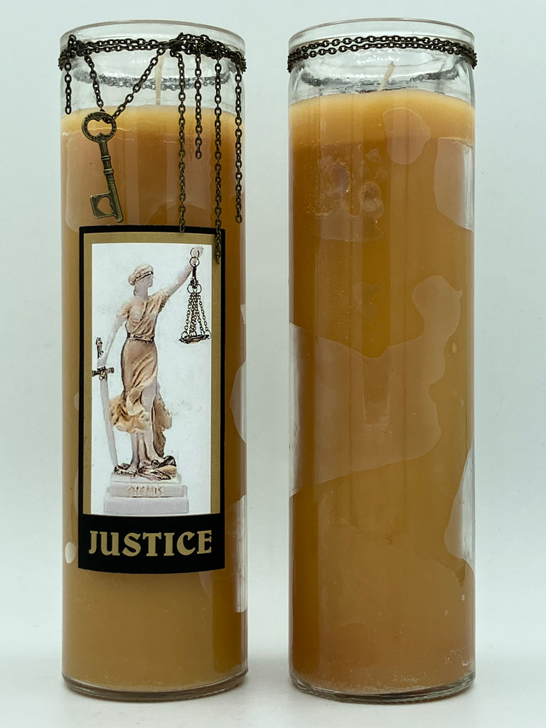 Here is a new and extremely powerful candle to be used when justice MUST be served. All too often the twists and turns of the legal system result in misinformation, bias, and injustice imposed instead of truth, liberty, and the pursuit of happiness. This unique candle represents Justitia, the Lady of Justice, as the moral force of our legal systems as she holds the scales of truth with the candle featuring chains to be broken and a key to unlock truth. The blindfold symbolizes impartiality, the scales represent the weighing of evidence, the sword signifies the power of justice, and the snake at her feet represents justice overcoming evil. Should you, or a loved one, find yourself in the chains of the legal system, this candle should be in your arsenal of defense.